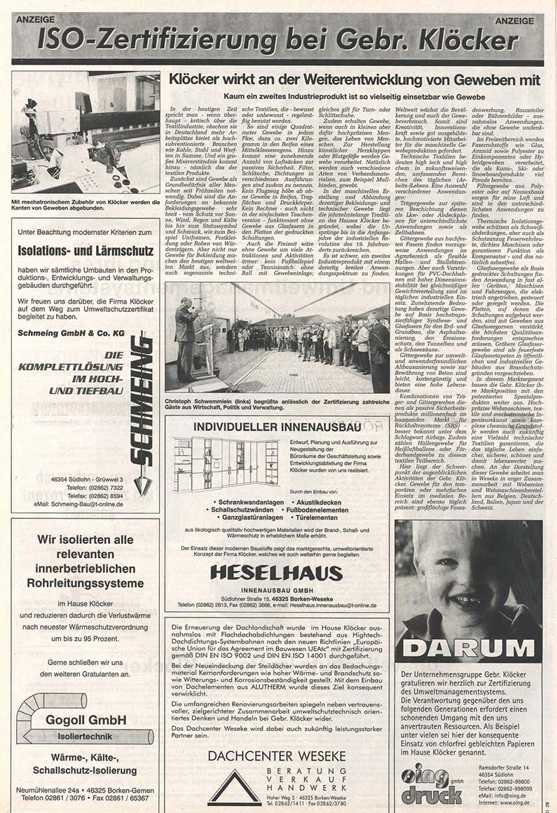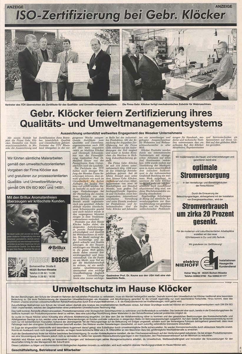 Zur Jahrtausendwende führt Klöcker nach umfangsreicher Überprüfung durch die zuständigen TÜV-Behörden ein Qualitäts- und Umweltmanagementsystem nach DIN EN ISO 9001 respektive DIN EN ISO 14001 ein, an dessen Regularien sich auch der indonesische Standort orientiert. Die Zertifizierung wird unter Mitwirkung zahlreicher Gäste aus Wirtschaft,