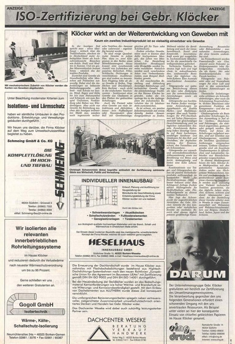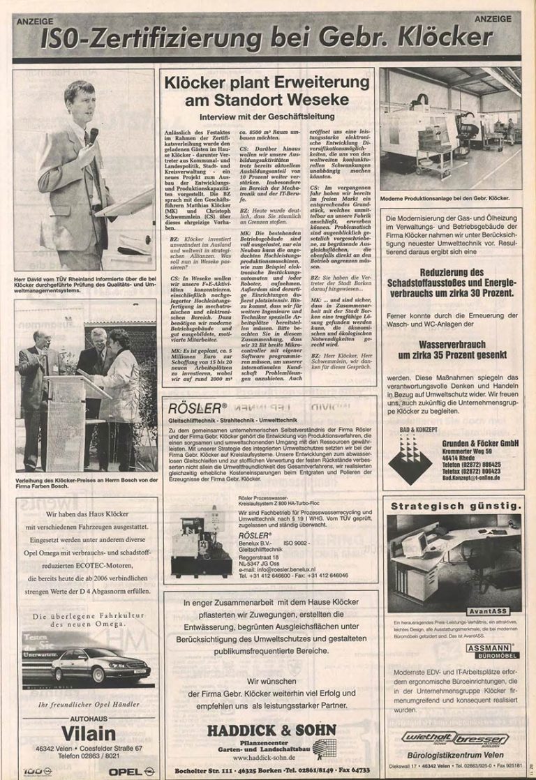 Umfangreiche Investitionen in Maschinen, hochqualifizierte Mitarbeiter sowie zuverlässigste C-Technologien komplettieren die neue Abteilung in Borken. Nach drei Kriegen und zwei Inflationen ist die Gebr. Klöcker GmbH optimistisch, ihre Erfolgsgeschichte durch den Vorstoß